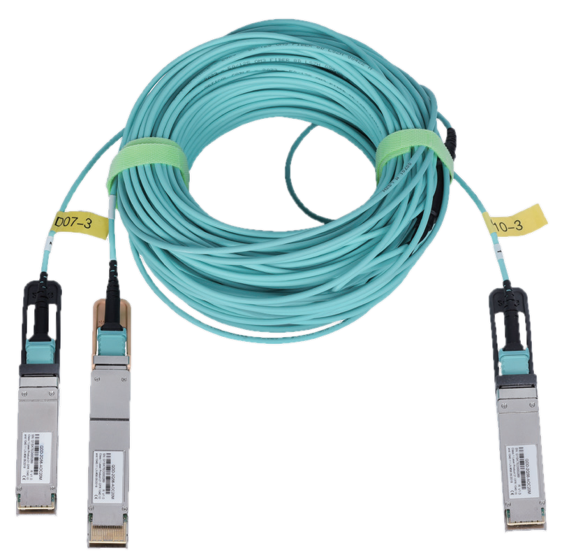 The QDD-2Q56-AOCxM and QDD-2Q56-AOCxM(B) breakout AOCs are suitable for short-distance transmission and offer a flexible way to connect within and across racks. The AOC with the breakout point closer to the 400G transceiver is QDD-2Q56-AOCxM, and closer to the 200G transceiver is QDD-2Q56-AOCxM(B). AOCs are much thinner and lighter than copper cables, which makes cable management easier. AOCs enable efficient system airflow, which is crucial in high-density racks. The QDD-2Q56-AOCxM is available in lengths of 3–70 meters. The QDD-2Q56-AOCxM(B) is available in lengths of 10–70 meters. See Datasheet Information for details.